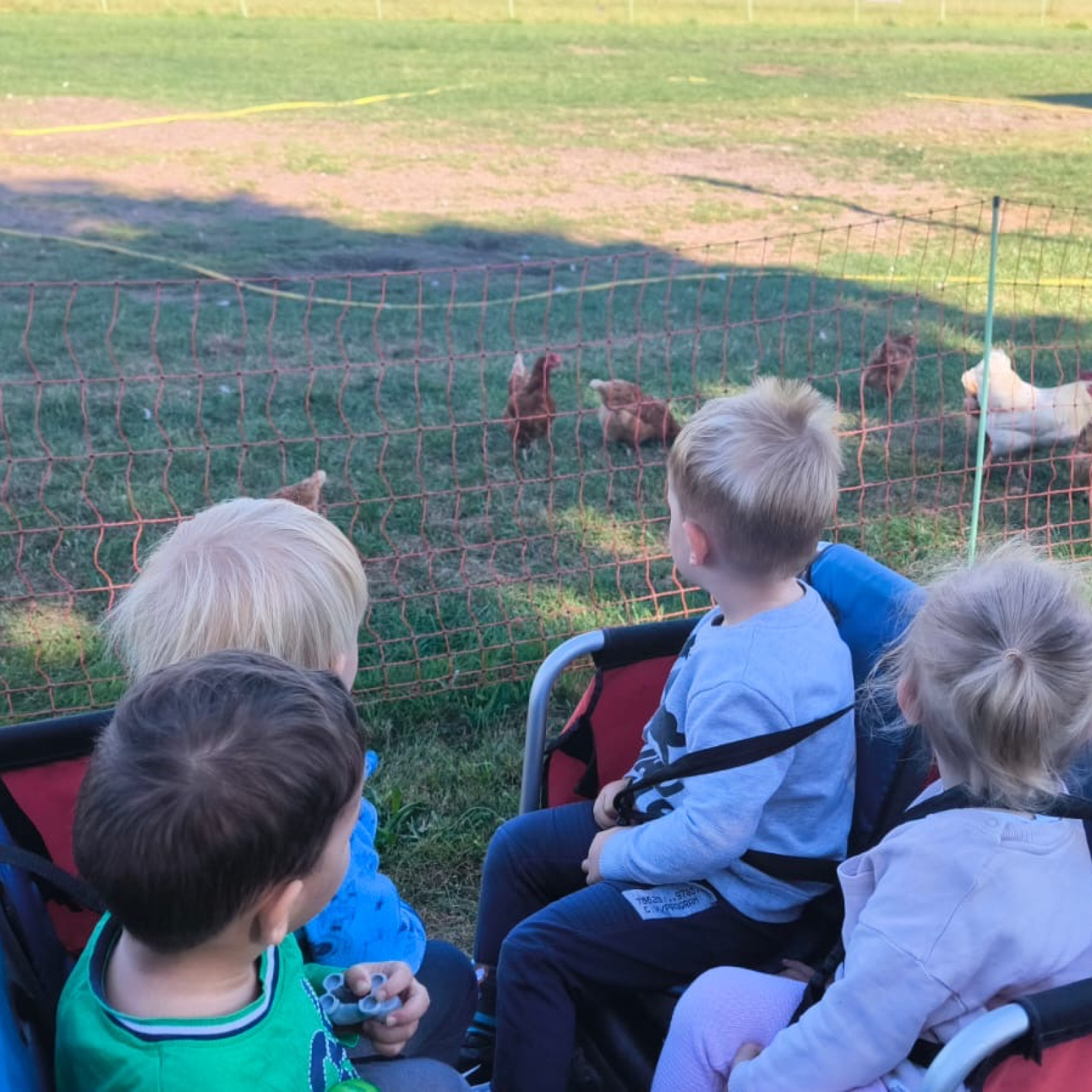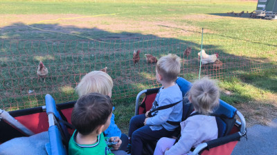 Freies Spiel, Bewegung und Kreativität nehmen den größten Teil in unserem Tagesablauf ein. Die Kinder lernen durch Bewegung ihren Körper besser kennen und trainieren dabei alle Sinne. Unsere Räume sind so ausgestattet, dass es genügend Platz zum Toben gibt. Natürlich gehen wir auch vor die Tür und erkunden die Umgebung. Bei Spaziergängen zum angrenzenden Bauernhof und Tierarzt (wo wir Hühner, Kühe, und Pferde beobachten können) in den Wald oder im Garten können die Kinder noch ganz andere Sachen ausprobieren und ihre Erfahrungen erweitern. Wir spielen dabei gerne mit und stehen bei neuen Herausforderungen den Kindern helfend zur Seite.